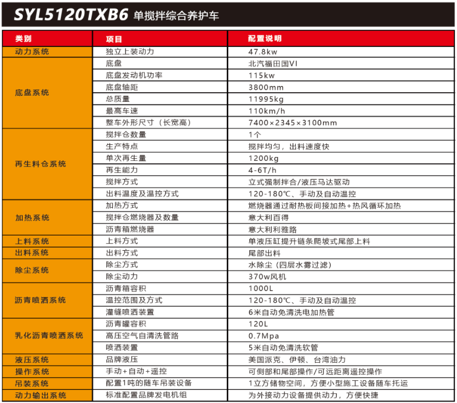 SYL5120TXB6單攪拌綜合養(yǎng)護(hù)車是一款集現(xiàn)場生產(chǎn)新瀝青混合料、瀝青路面冷料、舊料、銑刨料100%現(xiàn)場加熱再生利用 ,熱瀝青灑布、裂紋跟蹤灌縫、乳化瀝青噴灑、為其他裝置提供電力和液壓動力等多種功能于一體的瀝青路面熱再生綜合養(yǎng)護(hù)車。可實現(xiàn)多場合、多路面的各種類養(yǎng)護(hù)作業(yè) ,養(yǎng)護(hù)修補(bǔ)費(fèi)用低 ,作業(yè)快捷 ,高效率、節(jié)能環(huán)保性能突
